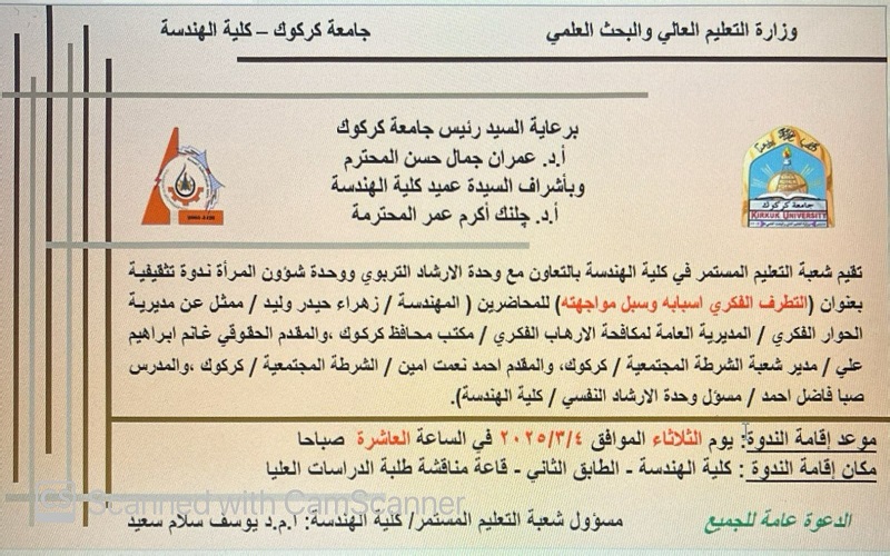 برعاية السيد رئيس جامعة كركوك أ.د. عمران جمال حسن المحترم وبإشراف السيدة عميد كلية الهندسة أ.د. جلنك أكرم عمر المحترمة تقيم شعبة التعليم المستمر في كلية الهندسة بالتعاون مع وحدة الإرشاد التربوي ووحدة شؤون المرأة ندوة تثقيفية بعنوان: "التطرف الفكري أسبابه وسبل مواجهته". يشارك في الندوة كلٌّ من: