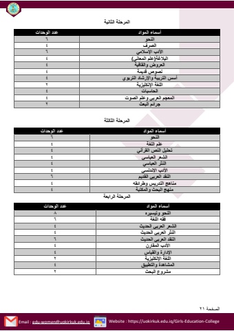 %u0627%u0644%u0635%u0641%u062d%u0629 21Email : edu-women@uokirkuk.edu.iq Website : https://uokirkuk.edu.iq/Girls-Education-College%u0627%u0644%u0645%u0631%u062d%u0644%u0629 %u0627%u0644%u062b%u0627%u0646%u064a%u0629 %u0623%u0633%u0645%u0627%u0621 %u0627%u0644%u0645%u0648%u0627%u062f %u0639%u062f%u062f %u0627%u0644%u0648%u062d%u062f%u0627%u062a%u0627%u0644%u0646%u062d%u0648 6%u0627%u0644%u0635%u0631%u0641 4%u0627%u0623%u0644%u062f%u0628 %u0627%u0625%u0644%u0633%u0627%u0644%u0645%u064a 6%u0627%u0644%u0628%u0627%u0644%u063a%u0629)%u0639%u0644%u0645 %u0627%u0644%u0645%u0639%u0627%u0646%u064a( 4%u0627%u0644%u0639%u0631%u0648%u0636 %u0648%u0627%u0644%u0642%u0627%u0641%u064a%u0629 4%u0646%u0635%u0648%u0635 %u0642%u062f%u064a%u0645%u0629 4%u0623%u0633%u0633 %u0627%u0644%u062a%u0631%u0628%u064a%u0629 %u0648%u0627%u0625%u0644%u0631%u0634%u0627%u062f %u0627%u0644%u062a%u0631%u0628%u0648%u064a 4%u0627%u0644%u0644%u063a%u0629 %u0627%u0625%u0644%u0646%u0643%u0644%u064a%u0632%u064a%u0629 2%u0627%u0644%u062d%u0627%u0633%u0628%u0627%u062a 4%u0627%u0644%u0645%u0639%u062c%u0645 %u0627%u0644%u0639%u0631%u0628%u064a %u0648%u0639%u0644%u0645 %u0627%u0644%u0635%u0648%u062a 4%u062c%u0631%u0627%u0626%u0645 %u0627%u0644%u0628%u0639%u062b 2%u0627%u0644%u0645%u0631%u062d%u0644%u0629 %u0627%u0644%u062b%u0627%u0644%u062b%u0629 %u0623%u0633%u0645%u0627%u0621 %u0627%u0644%u0645%u0648%u0627%u062f %u0639%u062f%u062f %u0627%u0644%u0648%u062d%u062f%u0627%u062a%u0627%u0644%u0646%u062d%u0648 6%u0639%u0644%u0645 %u0627%u0644%u0644%u063a%u0629 4%u062a%u062d%u0644%u064a%u0644 %u0627%u0644%u0646%u0635 %u0627%u0644%u0642%u0631%u0622%u0646%u064a 4%u0627%u0644%u0634%u0639%u0631 %u0627%u0644%u0639%u0628%u0627%u0633%u064a 4%u0627%u0644%u0646%u062b%u0631 %u0627%u0644%u0639%u0628%u0627%u0633%u064a 4%u0627%u0623%u0644%u062f%u0628 %u0627%u0627%u0644%u0646%u062f%u0644%u0633%u064a 4%u0627%u0644%u0646%u0642%u062f %u0627%u0644%u0639%u0631%u0628%u064a %u0627%u0644%u0642%u062f%u064a%u0645 6%u0645%u0646%u0627%u0647%u062c %u0627%u0644%u062a%u062f%u0631%u064a%u0633 %u0648%u0637%u0631%u0627%u0626%u0642%u0647 4%u0645%u0646%u0647%u062c %u0627%u0644%u0628%u062d%u062b %u0648%u0627%u0644%u0645%u0643%u062a%u0628%u0629 4%u0627%u0644%u0645%u0631%u062d%u0644%u0629 %u0627%u0644%u0631%u0627%u0628%u0639%u0629 %u0623%u0633%u0645%u0627%u0621 %u0627%u0644%u0645%u0648%u0627%u062f %u0639%u062f%u062f %u0627%u0644%u0648%u062d%u062f%u0627%u062a%u0627%u0644%u0646%u062d%u0648 %u0648%u062a%u064a%u0633%u064a%u0631%u0647 8%u0641%u0642%u0647 %u0627%u0644%u0644%u063a%u0629 6%u0627%u0644%u0634%u0639%u0631 %u0627%u0644%u0639%u0631%u0628%u064a %u0627%u0644%u062d%u062f%u064a%u062b 4%u0627%u0644%u0646%u062b%u0631 %u0627%u0644%u0639%u0631%u0628%u064a %u0627%u0644%u062d%u062f%u064a%u062b 4%u0627%u0644%u0646%u0642%u062f %u0627%u0644%u0639%u0631%u0628%u064a %u0627%u0644%u062d%u062f%u064a%u062b 6%u0627%u0623%u0644%u062f%u0628 %u0627%u0644%u0645%u0642%u0627%u0631%u0646 4%u0627%u0625%u0644%u062f%u0627%u0631%u0629 %u0648%u0627%u0644%u0642%u064a%u0627%u0633 4%u0627%u0644%u0644%u063a%u0629 %u0627%u0625%u0644%u0646%u0643%u0644%u064a%u0632%u064a%u0629 2%u0627%u0644%u0645%u0634%u0627%u0647%u062f%u0629 %u0648%u0627%u0644%u062a%u0637%u0628%u064a%u0642 4%u0645%u0634%u0631%u0648%u0639 %u0627%u0644%u0628%u062d%u062b 2