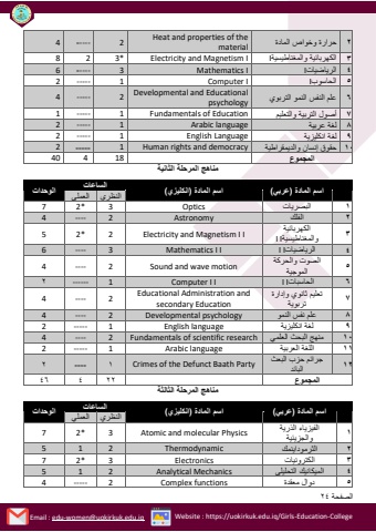%u0627%u0644%u0635%u0641%u062d%u0629 24Email : edu-women@uokirkuk.edu.iq Website : https://uokirkuk.edu.iq/Girls-Education-College2 %u0629%u0633%u062e%u0633 %u0635%u0629 %u0628%u062e%u0645%u062f %u0629Heat and properties of the material 4 %u0629 -----28 2 3* Electricity and Magnetism I I%u0645%u0627%u0642%u0633%u0642%u0639 %u0628%u062e%u0627 %u0642%u0645%u0644%u0642%u0639%u0629%u0633 %u0628%u0648%u0647 36 %u0629 -----3 Mathematics I I%u0642%u0645%u064a%u0629 %u0642%u0645 %u0628 42 ----- 1 Computer I I%u0645%u0633%u0633%u0628%u0629 %u0628 56 %u0627%u0627 %u0629 %u0628 %u064a %u0629 %u0628 %u062e%u0633%u0629 %u0628%u0648 %u0642%u0633%u064a%u0629Developmental and Educational psychology 4 ----- 21 ----- 1 Fundamentals of Education %u0629 %u0628%u0648%u0639%u0627%u0642 %u0642%u0642%u0639%u0629%u0633 %u0628%u0648 %u0623%u0635%u0633%u0644%u0629 72 ----- 1 Arabic language %u0642%u0642%u0639%u0629 %u0628%u0627%u0639%u0629%u0627 82 ----- 1 English Language %u0648%u0627%u0642%u0621%u0642%u0639%u0629 %u0628%u0627%u0639%u0629 92 %u0629 -----1 Human rights and democracy %u0627%u0642%u0639%u0629 %u0628%u062f%u0642%u062e%u0642 %u0633%u0645%u0646%u0629%u0633 %u0642%u0633%u0642%u0629%u0631 1040 4 18 %u0627%u0644%u0645%u062c%u0645%u0648%u0639%u0645%u0646%u0627%u0647%u062c %u0627%u0644%u0645%u0631%u062d%u0644%u0629 %u0627%u0644%u062b%u0627%u0646%u064a%u0629 %u0628 %u0648 %u064a%u0629 %u0628%u0639%u062e%u0627 %u0627%u0644%u0648%u062d%u062f%u0627%u062a %u0627%u0644%u0633%u0627%u0639%u0627%u062a %u0627%u0633%u0645 %u0627%u0644%u0645%u0627%u062f%u0629 )%u0639%u0631%u0628%u064a( %u0627%u0633%u0645 %u0627%u0644%u0645%u0627%u062f%u0629 )%u0627%u0646%u0643%u0644%u064a%u0632%u064a( 7 2* 3 Optics %u0642%u0645%u064a%u0629 %u0628%u0642%u0635 14 ---- 2 Astronomy %u0628%u064a%u0627%u0643 23 %u0628%u0648%u0647 %u0642%u0645%u0644%u0642%u0639%u0629I I%u0645%u0627%u0642%u0633%u0642%u0639 %u0628%u062e%u0627 %u0633 5 2* 2 Electricity and Magnetism I I6 ---- 3 Mathematics I I I I%u0642%u0645%u064a%u0629 %u0642%u0645 %u0628 45 %u0628%u0635%u0633%u064a%u0629%u0633 %u0628 %u0648%u0639%u0629%u0628%u062e%u0633%u062c%u0642%u0639%u0629 4 ---- 2 Sound and wave motion2 ------ 1 Computer I I I I%u0645%u0633%u0642%u0645%u064a%u0629 %u0628 67%u0648%u0639%u0627%u0642 %u0629%u062b%u0645 %u0633%u064a%u0629%u0633%u0631%u062f %u0629%u0648 %u0642%u0633%u0642%u0639%u0629Educational Administration and secondary Education 4 ---- 28 %u0627%u0627 %u0629 %u064a %u0629 %u0628 %u062e%u0633%u0629 psychology Developmental 2 ---- 42 ----- 1 English language %u0648%u0627%u0642%u0621%u0642%u0639%u0629 %u0628%u0627%u0639%u0629 94 ---- 2 Fundamentals of scientific research %u0628%u0639%u0627%u062e %u0639%u0629 %u0628%u0642 %u0647%u062c%u0629 %u062e 102 ----- 1 Arabic language %u0642%u0642%u0639%u0629 %u0628%u0639 %u0628%u0627%u0627%u0639%u0629 11%u062c %u0644 %u0629 %u0621%u0628%u0629 %u0628%u0642%u0639%u0639%u0629 12%u0628%u0642%u0645%u0644%u062f%u0629 2 %u0629 ----1 Crimes of the Defunct Baath Party46 4 22 %u0627%u0644%u0645%u062c%u0645%u0648%u0639%u0645%u0646%u0627%u0647%u062c %u0627%u0644%u0645%u0631%u062d%u0644%u0629 %u0627%u0644%u062b%u0627%u0644%u062b%u0629 %u0628 %u0648 %u064a%u0629 %u0628%u0639%u062e%u0627 %u0627%u0644%u0648%u062d%u062f%u0627%u062a %u0627%u0644%u0633%u0627%u0639%u0627%u062a %u0627%u0633%u0645 %u0627%u0644%u0645%u0627%u062f%u0629 )%u0639%u0631%u0628%u064a( %u0627%u0633%u0645 %u0627%u0644%u0645%u0627%u062f%u0629 )%u0627%u0646%u0643%u0644%u064a%u0632%u064a( 1 %u0628%u064a%u0642%u0621%u0642%u0645 %u0629 %u0628%u0630 %u0642%u0639%u0629%u0628%u062c%u0621%u0642%u0644%u0642%u0639%u0629 %u0633 7 2* 3 Atomic and molecular Physics5 1 2 Thermodynamic %u062e%u0643%u0629 %u0642 %u062e%u0633%u062f %u0628%u062b 27 2* 3 Electronics %u0642%u0645%u064a%u0629 %u0633 %u0628%u0648%u0648 35 1 2 Analytical Mechanics %u0629 %u0627%u0642%u0627 %u0628%u0648 %u0642%u0643%u0629 %u0628%u062e%u0642%u0648%u0645 44 ----- 2 Complex functions %u0629 %u0644%u0629%u062e%u0639%u0642%u062f %u062f%u0633 5
