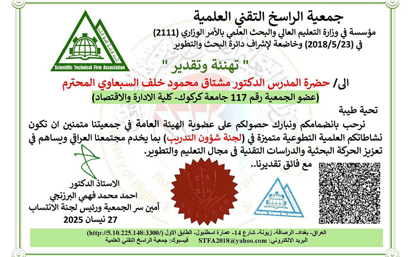 تدريسي من كلية الإدارة والاقتصاد بجامعة كركوك ينال لقب “مخترع معتمد” دولياً