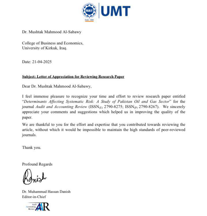 As part of supporting academic activities and enhancing academic presence in international forums, Dr. Mushtaq Mahmood Al-Sabawi, a lecturer in the College of Administration and Economics/Department of Business Management, was selected as a scientific reviewer for a research paper submitted to the Audit and Accounting Review (AAR), a prestigious international journal published by the University of Technology (UMT) in Pakistan.
