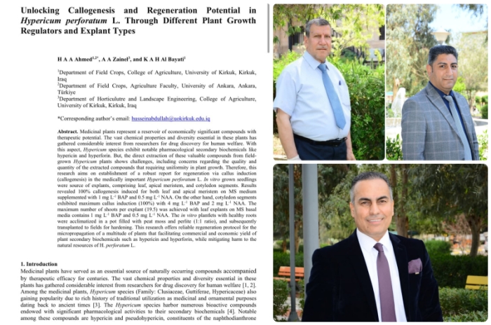 نشر فريق بحثي من كلية الزراعة مؤلف من الدكتور حسين عبدالله احمد والدكتور علي اصغر زينل والدكتور كريم عبدالله حسن، بحثا علميا في مجلة IOP Conf. Series: Earth and Environmental Science، البريطانية والمصنفة ضمن مستوعبات سكوبس Q3 . وأوضح الباحثون " أن البحث تناول دراسة متعمقة حول تعزيز التكاثر والتجديد في نبات Hypericum perforatum L. باستخدام منظمات نمو نباتية متنوعة وأنواع مختلفة من الأجزاء النباتية". واضافوا ، أن الدراسة تهدف الى تطوير بروتوكول فعّال لتحفيز تكوين الكالس في Hypericum perforatum داخل بيئة زراعية مختبرية مما يوفر آلية لتكاثر هذا النبات وزيادة إنتاجه بشكل مستدام.