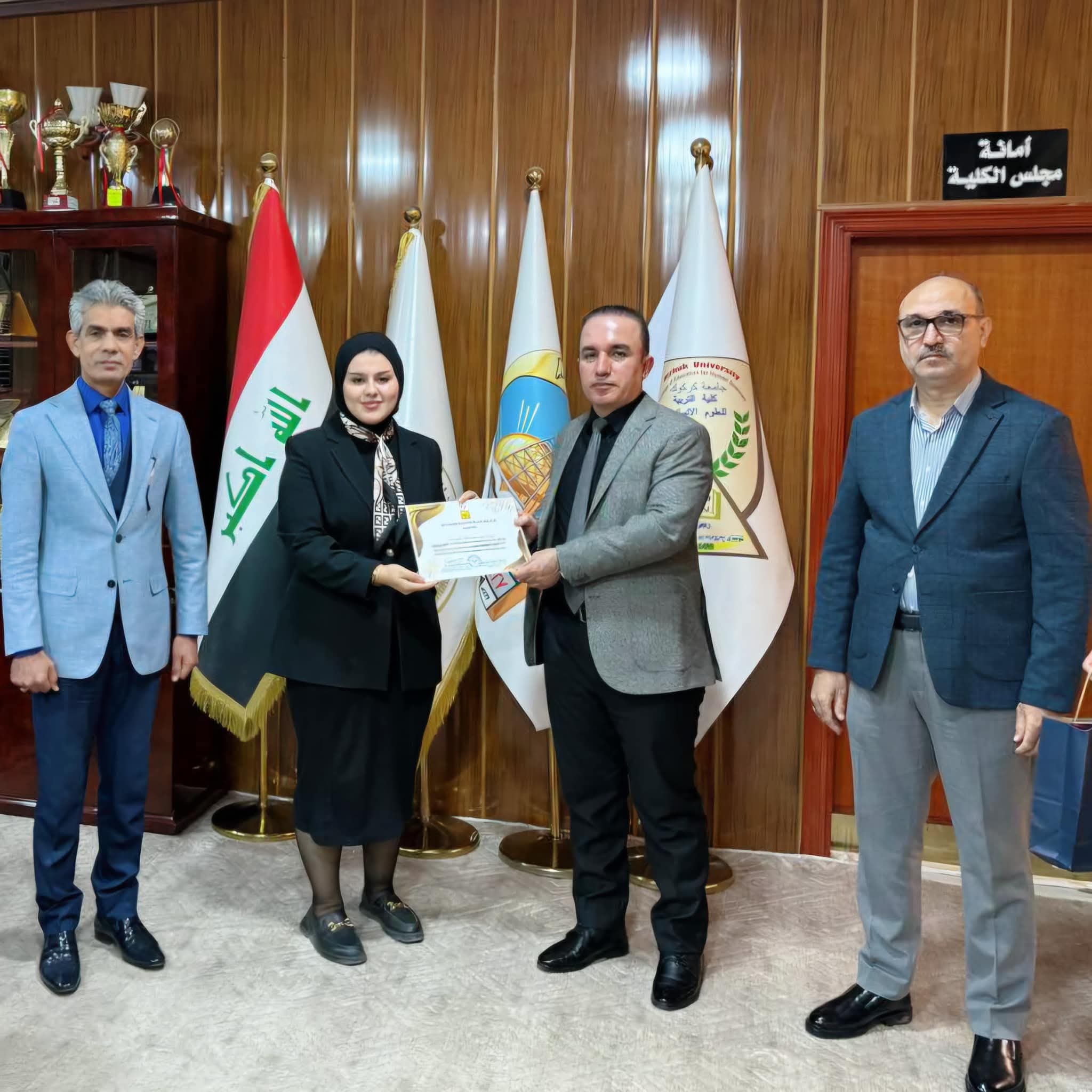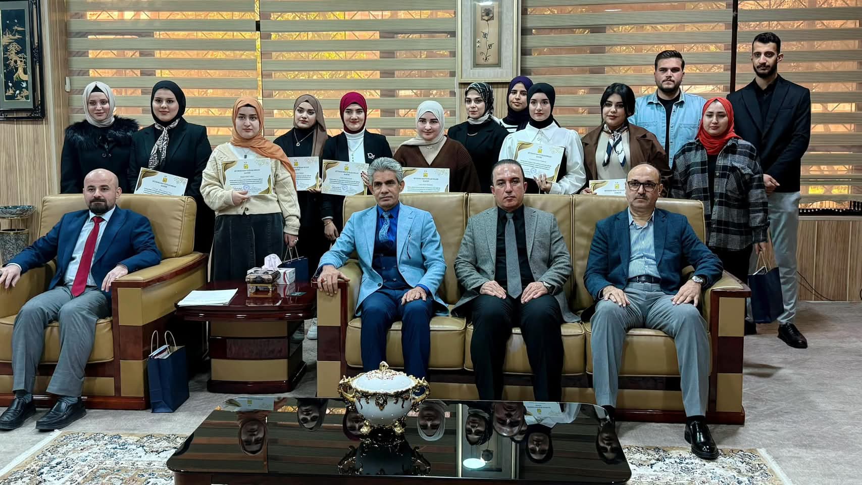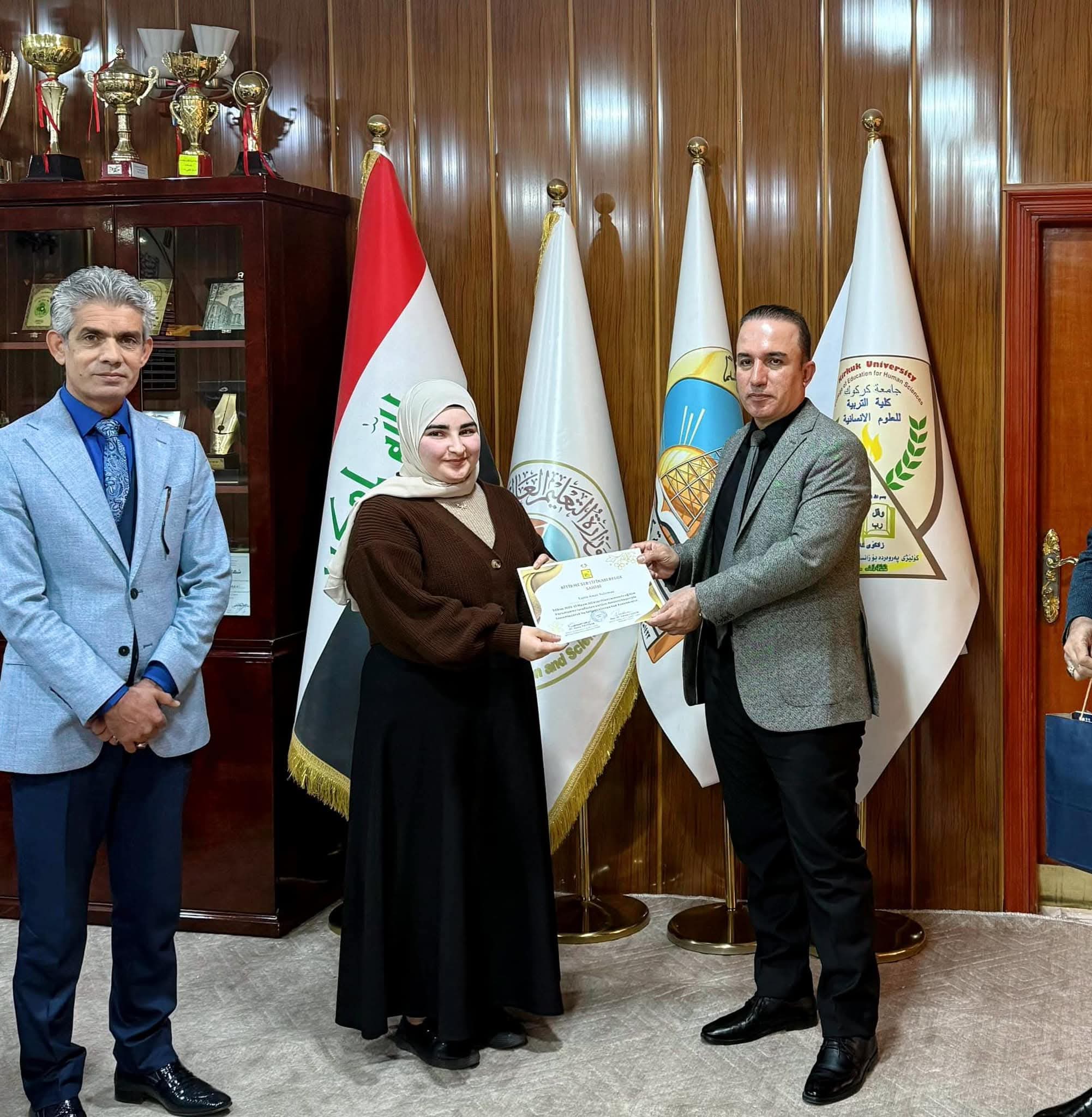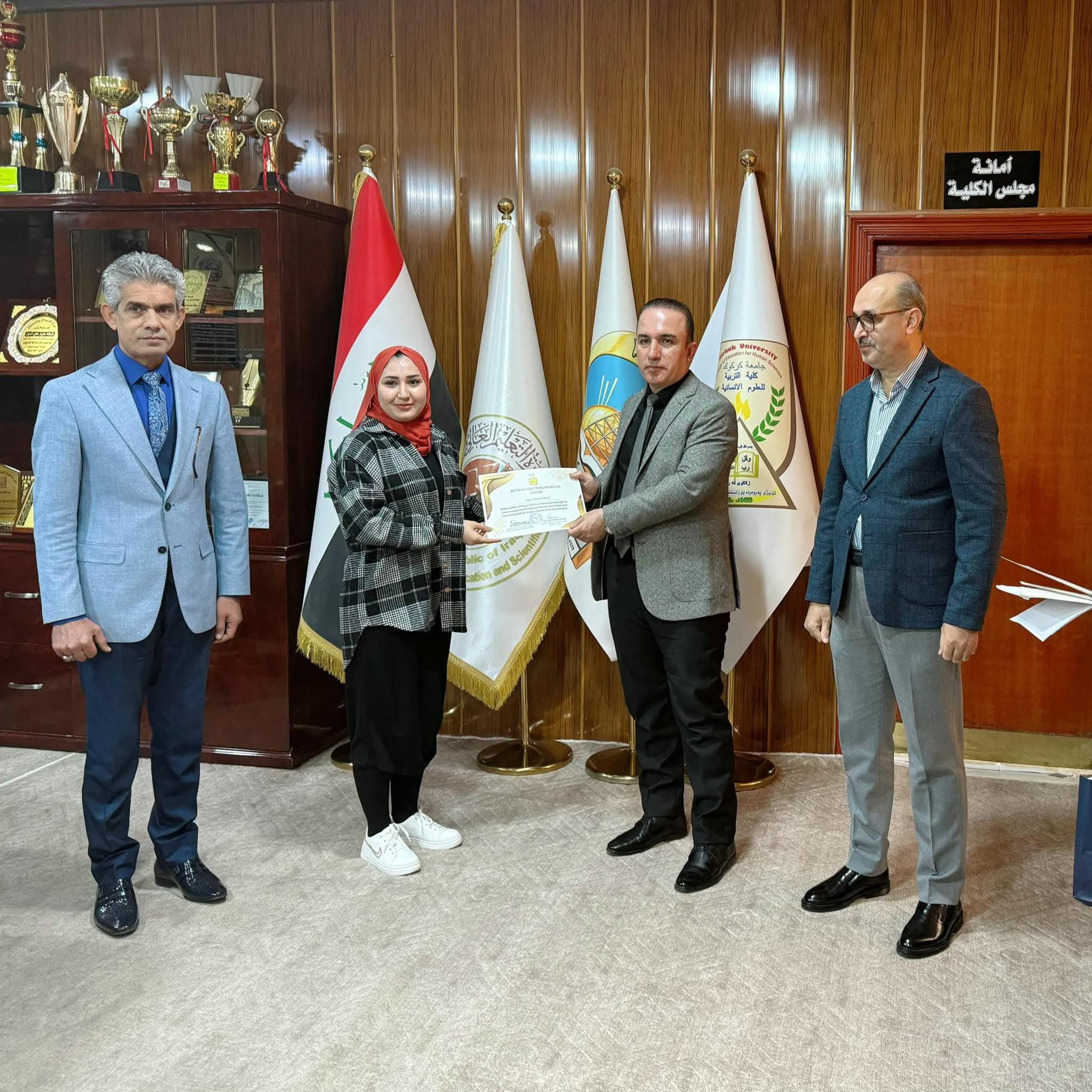 Under the generous patronage of the Dean, Prof. Dr. Farhad Aziz Mohiuddin, the Turkish Language Department at the College of Education for Humanities held a ceremony to honor distinguished students in the Dean's office. This honor came in appreciation of the distinguished academic efforts made by the students in their academic career and to motivate them to achieve more excellence and success. The Dean expressed his pride and appreciation for the academic level demonstrated by the students, stressing that this excellence is the fruit of their diligence and commitment to the solid academic standards that the college seeks to establish. He also pointed out the importance of supporting outstanding students as they are the nucleus of the future that will contribute to raising the scientific and academic level of the college. In conclusion, certificates of appreciation and symbolic gifts were distributed to the honored students in an atmosphere full of pride and honor.