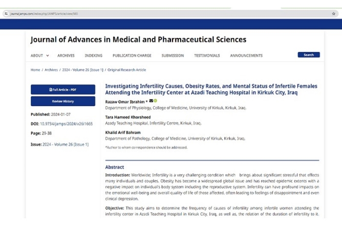 نشرت التدريسية في كلية الطب بجامعة كركوك الدكتورة رازاو عمر إبراهيم، بحثا علميا مشتركا في احدى المجلات العالمية للعلوم الصيدلية والطبية في الهند. وذكرت التدريسية ان البحث يهدف إلى تحديد أسباب العقم لدى النساء المصابات بالعقم المترددات على مركز العقم في مستشفى آزادي التعليمي في مدينة كركوك، العراق، فضلا عن معرفة مدى انتشار السمنة بين هؤلاء النساء، وتقييم معدل الاكتئاب والقلق والتحقيق في العوامل المتعلقة بهما.