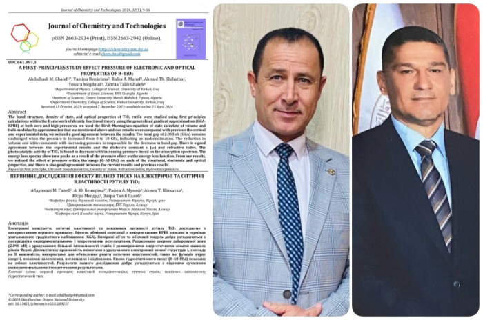 نشر الباحثون في كلية العلوم بجامعة كركوك، الاستاذ الدكتور عبد الهادي مردان غالب والاستاذ الدكتور رافع عبد الله منيف و م.م. زهراء طالب غالب، وبالتعاون مع باحث من مديرية تربية كركوك، وباحثين من جامعات جزائرية بحثاً علمياً بعنوان "A first-principles study effect pressure of electronic and optical properties of R-TiO2 " في مجلة عالمية رصينة Journal of Chemistry and technologies ضمن مستوعبات سكوبس وكلاريفيت. ويهدف البحث الى دراسة الخصائص الإلكترونية والبصرية لاوكسيد التيتانيوم (TiO2) باستخدام نظرية الكثافة الوظيفية (Density FunctionalTheory) ضمن التقريب (GGA-RPBE) عند ضغوط مختلفة. وعند مقارنة نتائج الدراسة الحالية مع الدراسات السابقة لوحظ وجود تغيير في فجوة الطاقة Eg , وبأستخدام معادلة (Birch Murnaghan equation ) تمت حساب معامل الحجم والحالة الحجمية بواسطة التقريب.