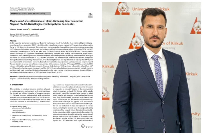 نشر التدريسي في كلية الهندسة، الدكتور غسان حسين، بالتعاون مع باحث في جامعة غازي عنتاب التركية بحثاً علمياً بعنوان(MagnesiumSulfateResistance of Strain-Hardening Fiber Reinforced Slag andFlyAsh-BasedEngineeredGeopolymerComposites) في مجلة جامعة الملك فهد للبترول والمعادن (Arabian Journal for Science and Engineering) والمصنفة ضمن مستوعبات سبرنگر Q1. وتناول البحث دراسة الخواص الميكانيكية والديمومة للخرسانة الجيوبولمرية منزوعة السمنت ومسلحة بألياف كحول البولي فينيل بعد غمرها في كبريتات المغنيسيوم بنسبة 5% ولمدة 120 يوم.
