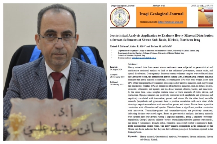 نشر التدريسي في كلية التربية للعلوم الإنسانية الاستاذ الدكتور عباس رشيد علي، بحثا علميا في مجلة في مجلة (Iraqi Geological Journal) وهي من المجلات العلمية الرصينة ضمن مستوعبات (سكوبس) العالمية.وتضمن البحث تحديد نوعية المعادن الثقيلة وتوزيعها الكمي في الرواسب الحديثة لحوض شوان الثانوي وبيان دورها في تحديد البيئة القديمة والعمليات الجيولوجية المختلفة المؤثرة على تكوين هذه المعادن واهميتها الاقتصادية وفهم اصل نشاءتها والظروف الجيولوجية والتكتونية التي ادت الى تكوينها وترسيبها.