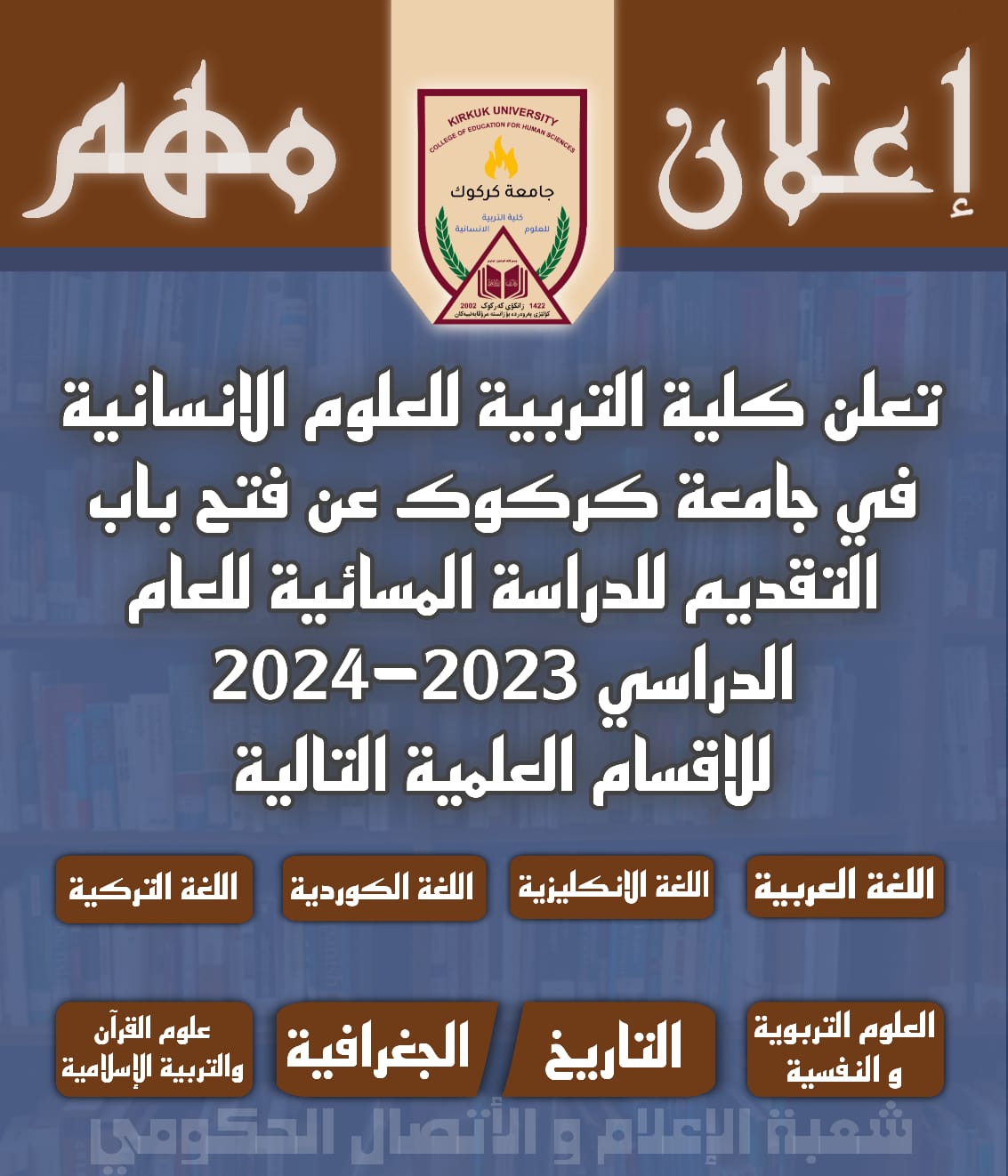 تعلن كلية التربية للعلوم الإنسانية / جامعة كركوك عن فتح باب التقديم للدراسة المسائية للعام الدراسي 2023-2024 حسب الضوابط والشروط الاتية:-