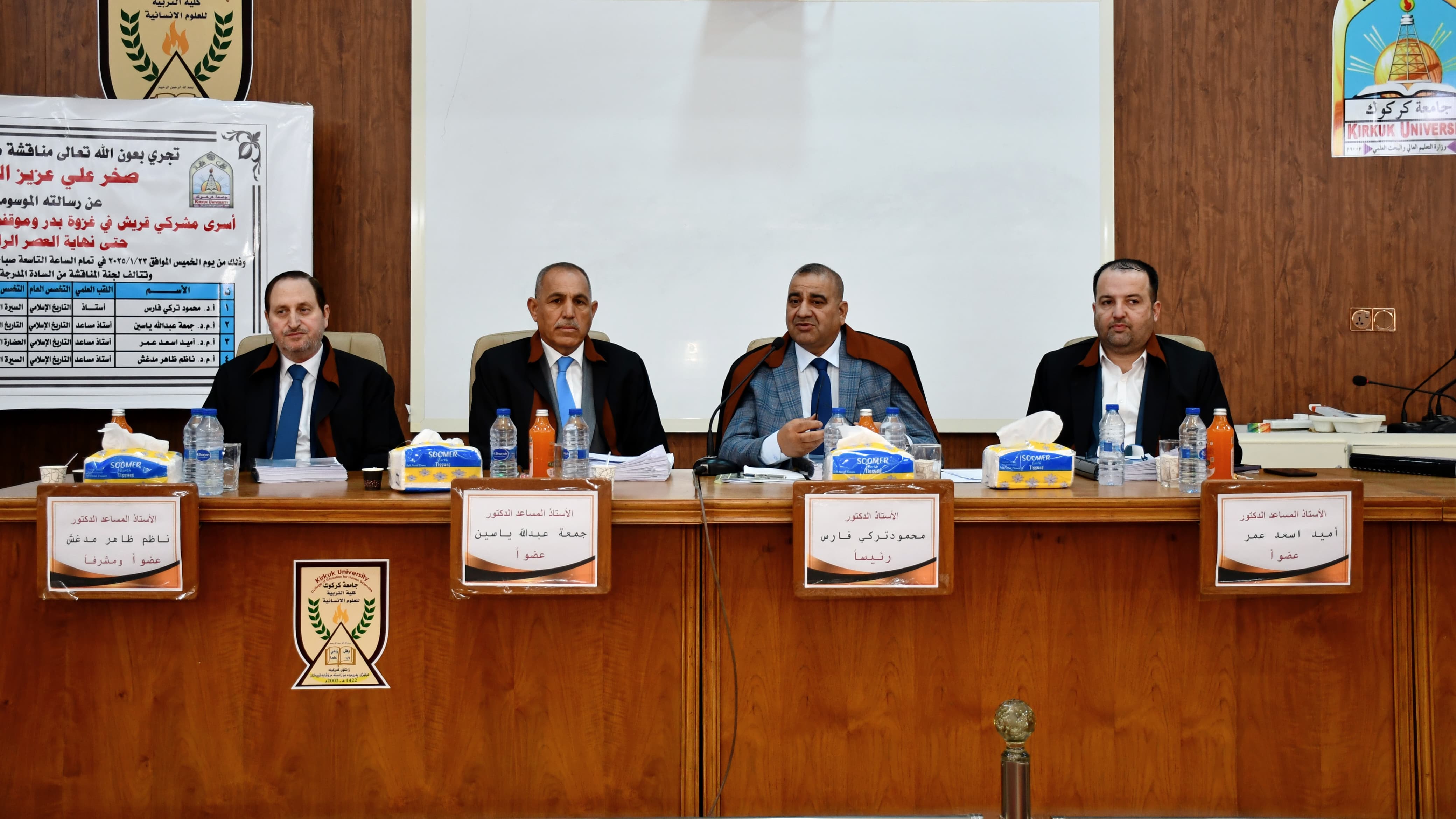 بحضور ورعاية السيد عميد كلية التربية للعلوم الإنسانية الأستاذ الدكتور فرهاد عزيز محيي الدين نوقشت في قسم التاريخ رسالة الماجستير الموسومة "اسرى مشركي قريش في غزوة بدر ودورهم في الدعوة الإسلامية حتى نهاية العصر الراشدي" للطالب صخر علي عزيز وعلى قاعة الكلية بتاريخ 23-1-2025 .