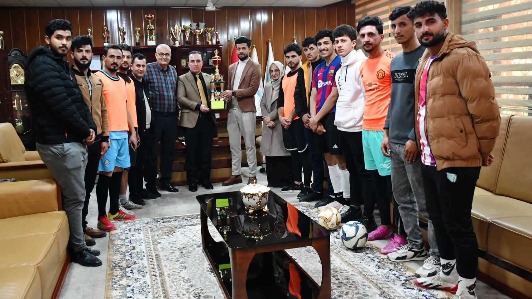 Under the patronage of Prof. Dr. Farhad Aziz Mohiuddin, Dean of the College of Education for Humanities, the Department of Educational and Psychological Sciences, in cooperation with the Student Activities Division, held a friendly football match between first-year students of morning and evening studies as part of the ongoing efforts to enhance the values of teamwork and develop students' personal skills. The match witnessed an atmosphere full of enthusiasm and competition, as the students presented a performance that reflected the spirit of cooperation and harmony, which are essential characteristics that the college seeks to instill in its students. The match concluded with the victory of the evening study team after a wonderful performance. The Dean praised the event, pointing out the importance of extracurricular activities in enhancing communication between students and developing their skills outside the classroom, stressing that these activities contribute to preparing a balanced generation academically and athletically.