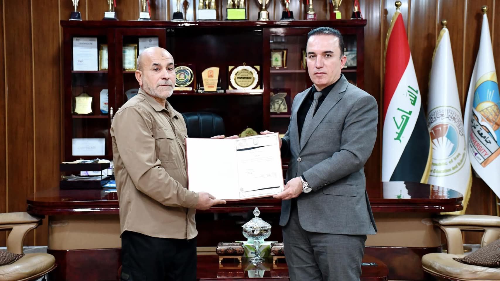 The Dean of the College of Education for Human Sciences, Professor Dr. Farhad Aziz Mohiuddin, honored the employee of the Follow-up Department, Mr. Ashdar Karim Juma, in appreciation of his dedication and sincerity in performing his daily tasks. His Excellency expressed his gratitude for Mr. Ashdar's efforts in ensuring the smooth running of work and maintaining commitment and order in the college. His Excellency stressed that the college highly appreciates the efforts made by its administrative cadres, stressing the importance of loyalty and responsibility. Mr. Ashdar Karim Juma, who is known for his keenness to perform his duties and his distinguished role in supporting the administrative service in the college, expressed his thanks and appreciation to the Dean for this generous gesture, stressing that he will continue his work with a spirit of giving and dedication.
