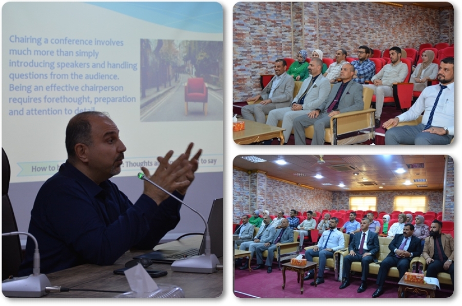 The workshop included a lecture in which Dr. Ahmed Mohammed Fakhreddin explained the responsibilities that fall on the shoulders of the chairman of the session and summarized them with several points, including the commitment of time at the beginning and end of each presentation , the preparation of the schedule of presentations presented by researchers in the session and the preparation of a set of questions about each presentation،