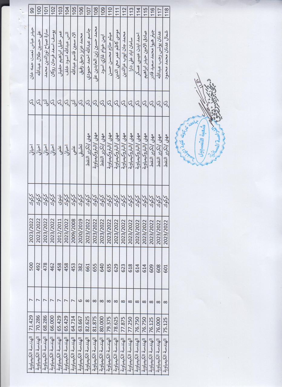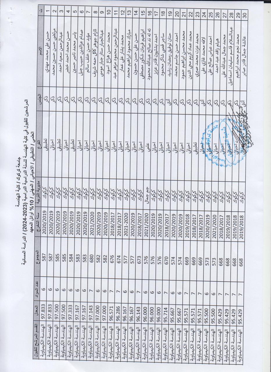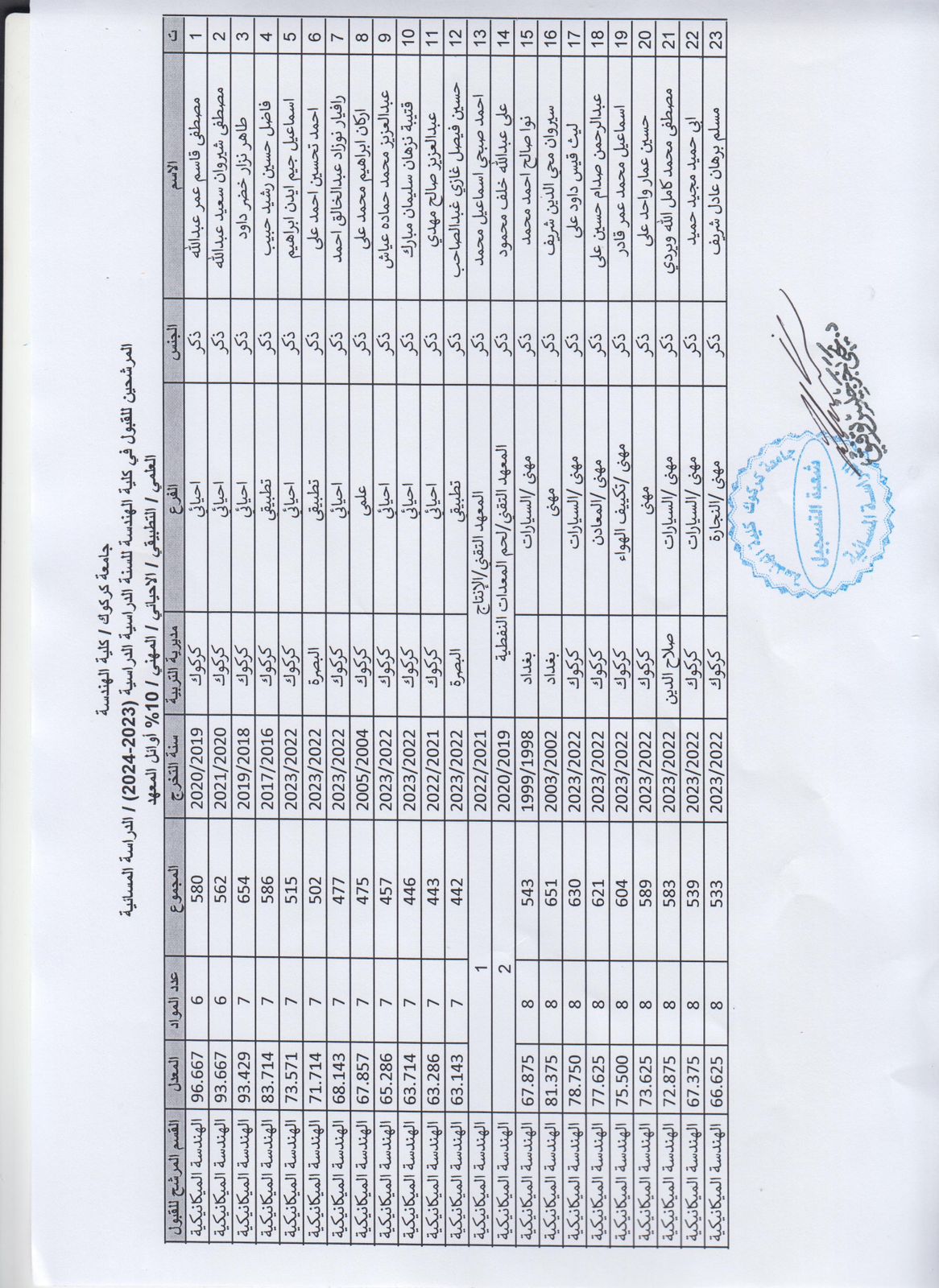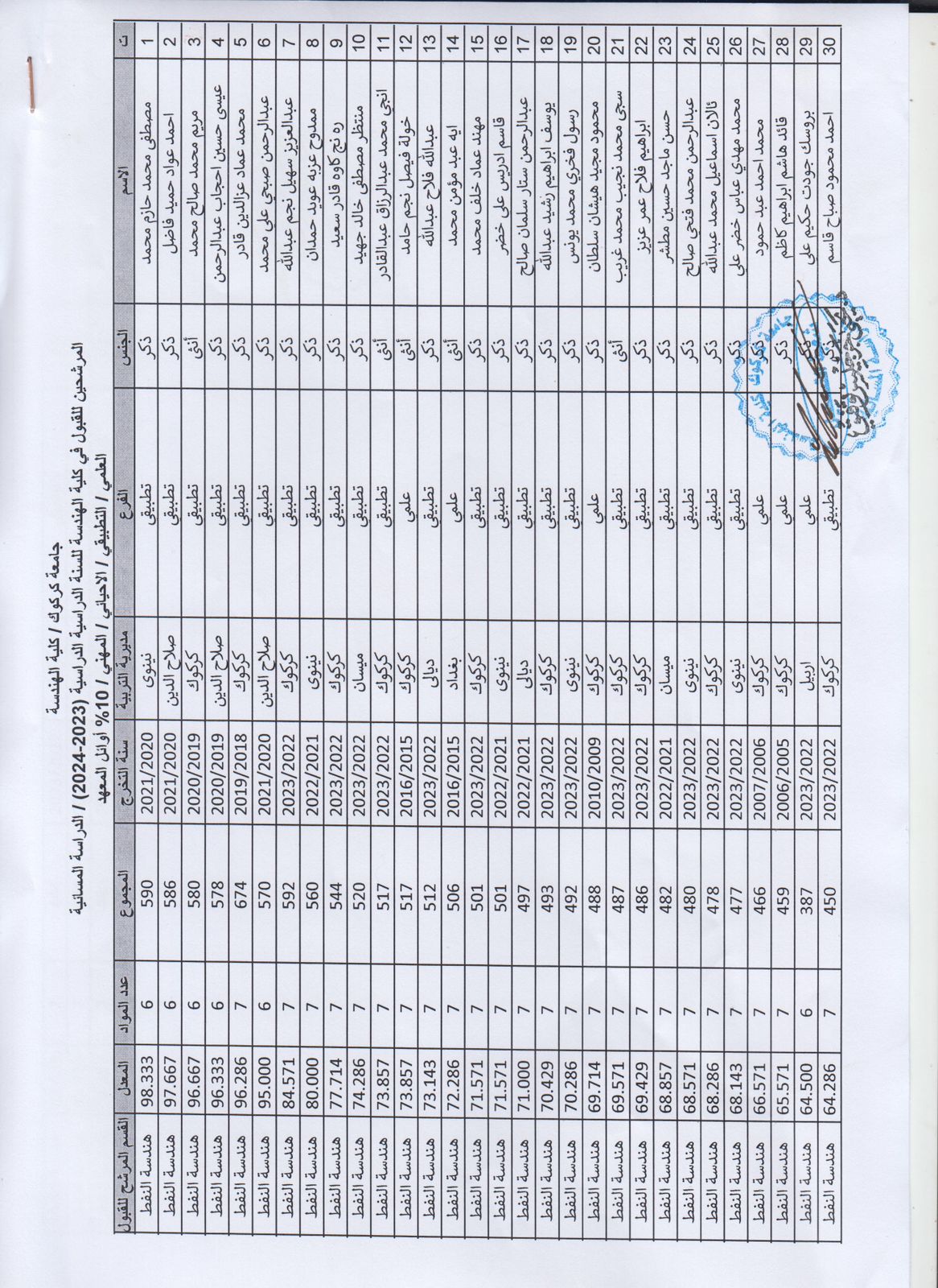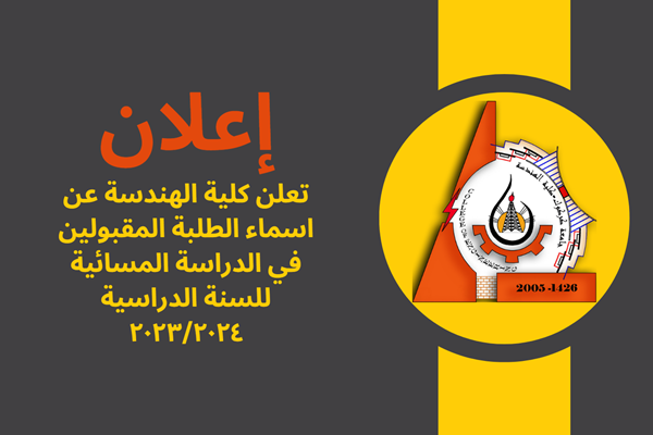 تعلن كلية الهندسة عن اسماء الطلبة المقبولين في الدراسة المسائية للسنة الدراسية ٢٠٢٣/٢٠٢٤