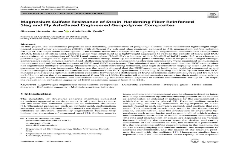 نشر التدريسي من قسم الهندسة المدنية في كلية الهندسة م.د.غسان حسين الحمر بالتعاون مع الاستاذ الدكتور عبدالقادر چيفك الباحث والتدريسي في جامعة غازي عنتاب التركية بحثاً علمياً بعنوان(MagnesiumSulfateResistance of Strain-Hardening Fiber Reinforced Slag andFlyAsh-BasedEngineeredGeopolymerComposites) في مجلة جامعة الملك فهد للبترول والمعادن (Arabian Journal for Science and Engineering) والمصنفة ضمن مستوعبات سبرنگر Q1.