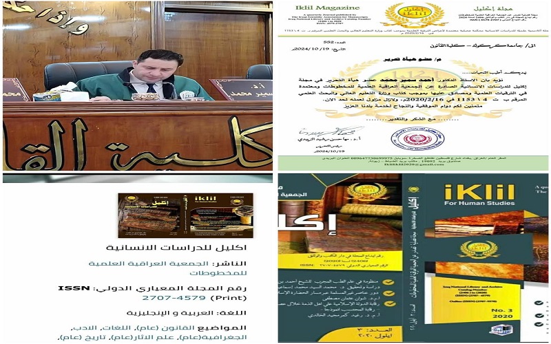 تم أختيار التدريسي في كلية القانون والعلوم السياسية الأستاذ الدكتور احمد سمير محمد لعضوية هيأة تحرير مجلة إكليل للدراسات الإنسانية الصادرة عن الجمعية العلمية العراقية للمخطوطات في بغداد.