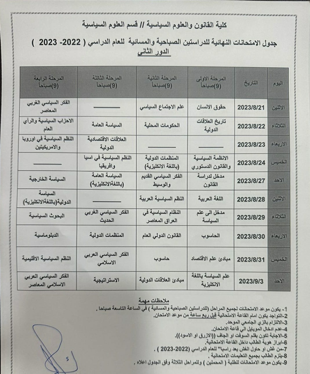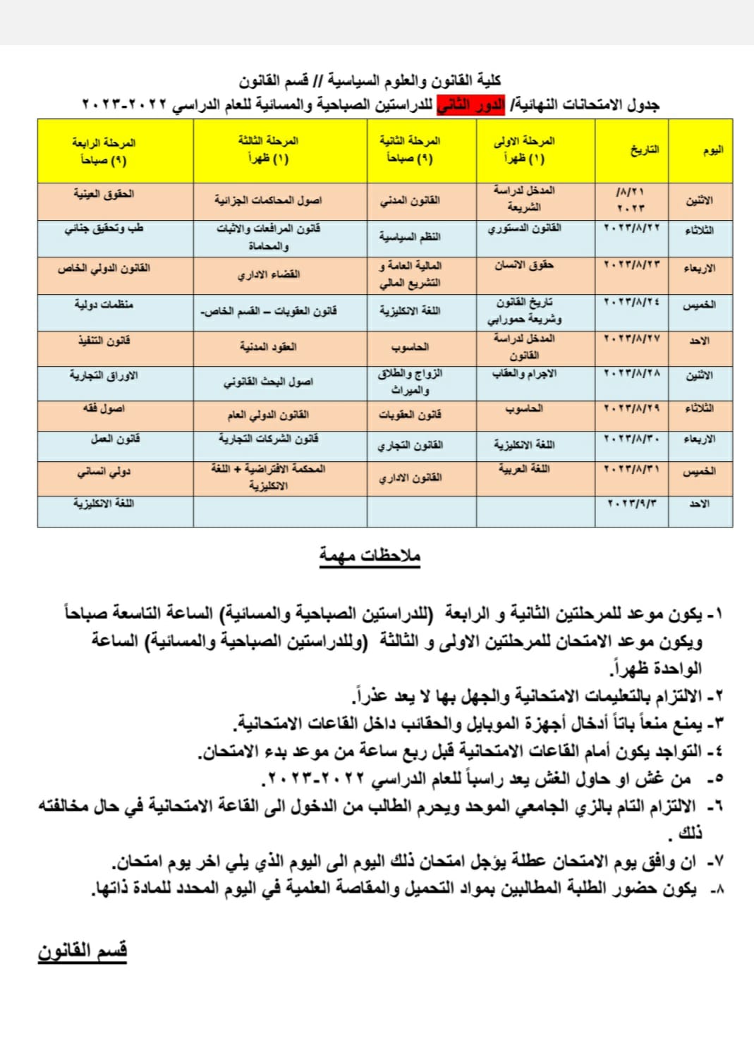 جدول الامتحانات النهائية/ الدور الثاني لقسمي القانون والعلوم السياسية وللدراستين الصباحية والمسائية للعام الدراسي 2022 - 2023