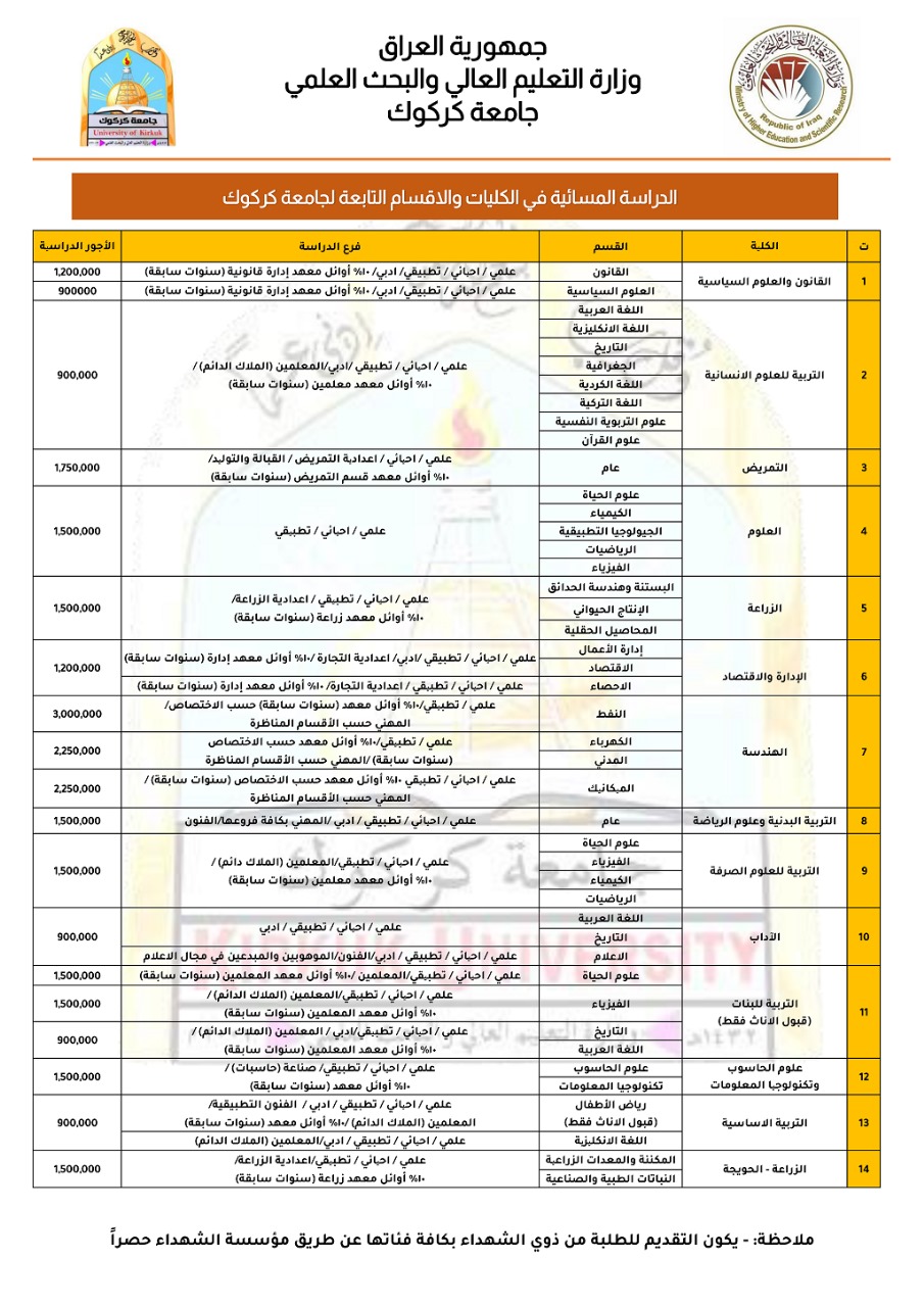 تعلن جامعة كركوك عن فتح باب التقديم الى الدراسة المسائية في كلياتها للسنة الدراسية 2023/2024