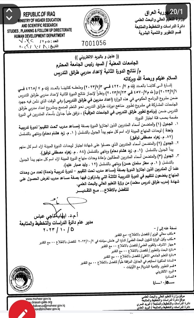 حصل الاستاذ المساعد الدكتور بركان سعيد عثمان التدريسي في كلية العلوم/ قسم الجيولوجيا التطبيقية على شهادة مدرب معتمد TOT ضمن مشروع البرنامج الحكومي (اعداد مدربين في طرائق التدريس المحدثة) والمعد من قبل وزارة التعليم العالي والبحث العلمي/ قسم التطوير والتنمية البشرية من اجل تطوير وتعزيز مستوى التعليم في الجامعات العراقية . حيث تضمنت الدورة برنامج مكثف ومتخصص في مجال طرائق التدريس والتي اختتمت شهر اب الماضي في رحاب جامعة العين الاهلية /جامعة ي قار. وفي الوقت نفسه ثمن الوزارة جهود الجامعات العراقية المشاركة في مشروع اعداد مدربي طرائق التدريس ضمن (برنامج تطوير طرائق التدريس في الجامعات العراقية)